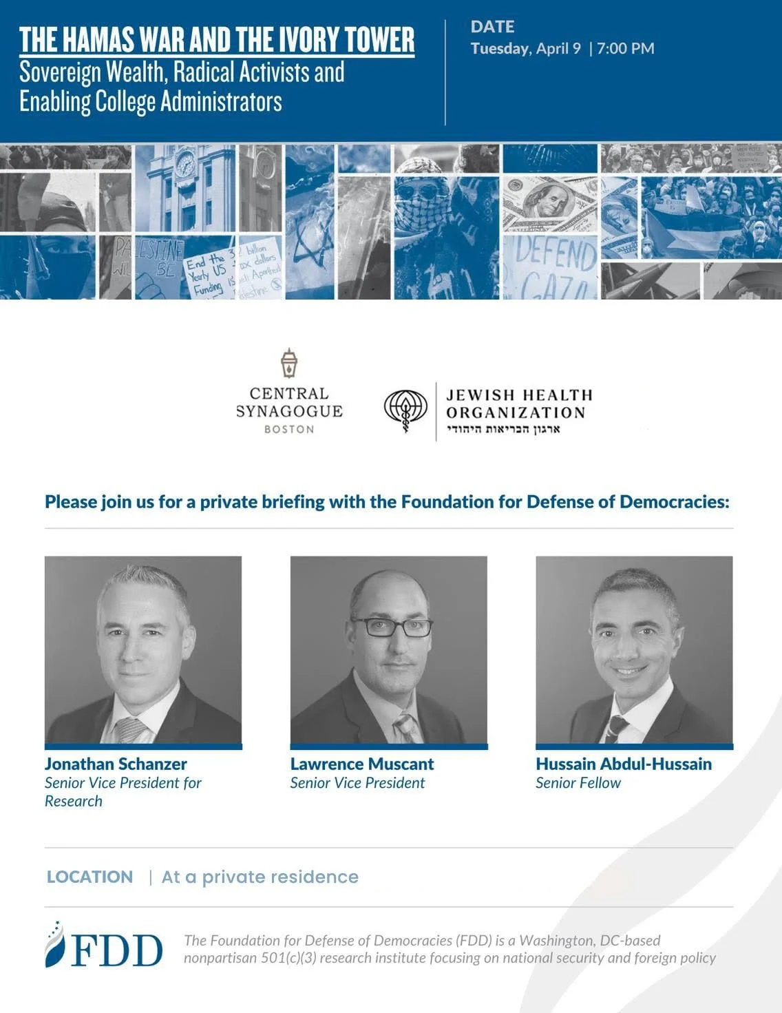 Three well-known experts on the surge in campus Jew & Israel hatred, Jonathan Schanzer, Lawrence Muscant, and Hussain Abdul-Hussain, will speak on how Middle East money, anti-Israel activists, and administrators are destroying collegiate life for Jewish students.